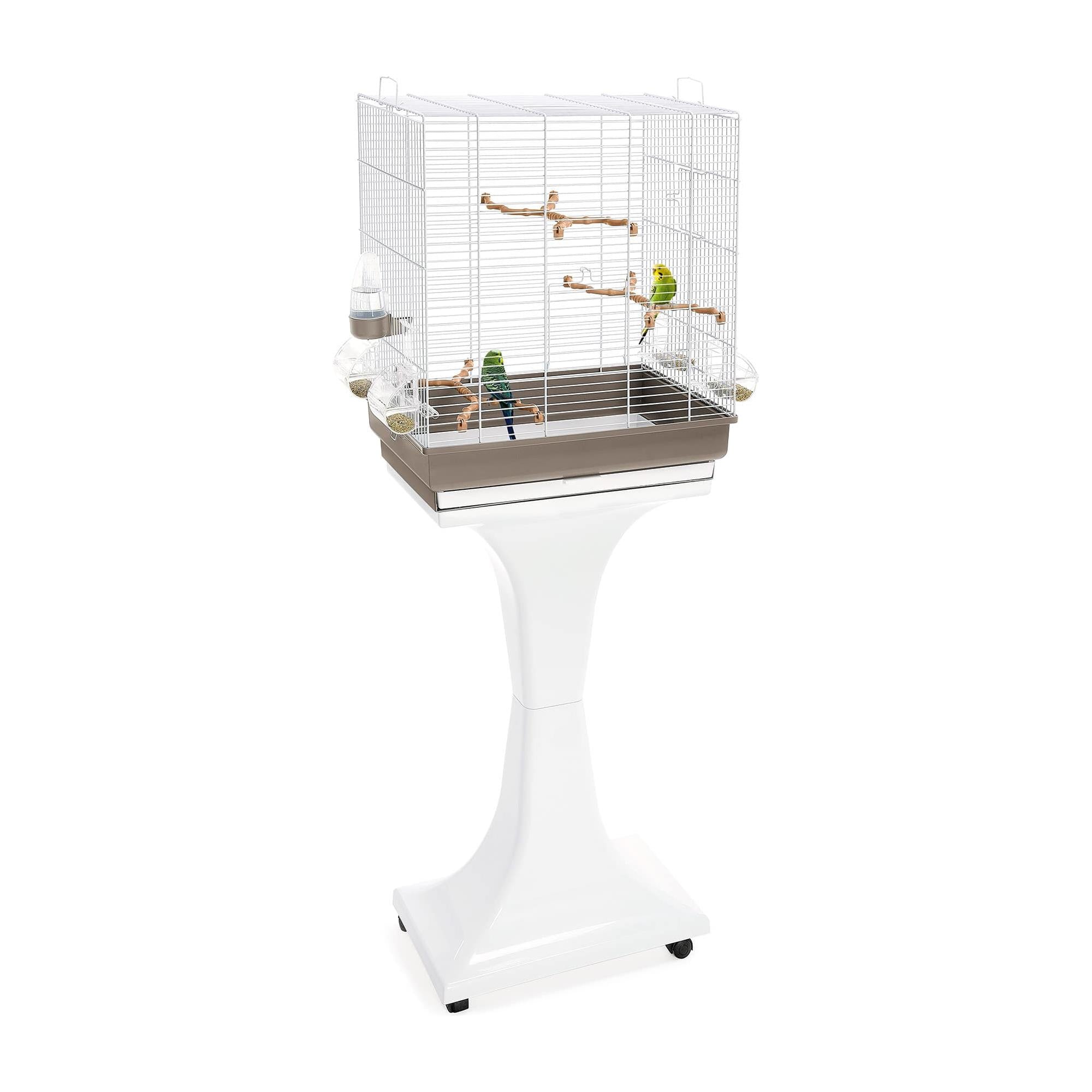 La gabbia Camilla è una gabbia per canarini, cocorite e piccoli esotici a base rettangolare, essenziale ma spaziosa e comprensiva di piedistallo, in plastica marrone per la versione ottonata e tortora nella versione bianca, con ruote piroettanti. La gabbia si pulisce in un attimo grazie al fondo in plastica con cassetto raccogli sporco estraibile. Camilla è acquistabile completa dei seguenti accessori: quattro mangiatoie Mia in plastica trasparente, un beverino Tweety 100 e tre posatoi a forma di ramo che permettono di variare continuamente la presa delle zampette, rendendo l’utilizzo simile a quello che si trova in natura.