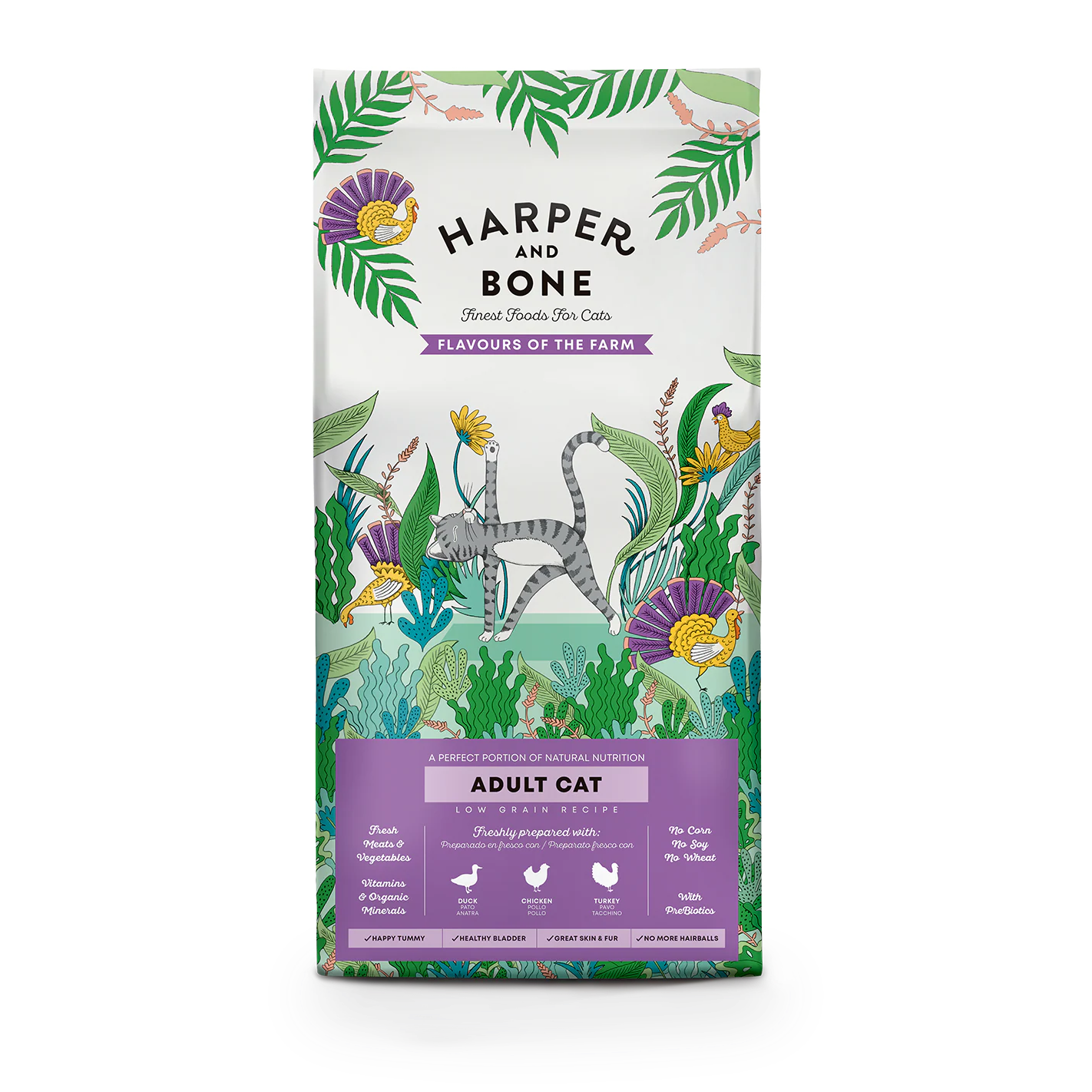 Questo eccellente e completo cibo secco per gatti sterilizzati è una miscela irresistibilmente saporita e ricca di proteine, che include tacchino, pollo e anatra della migliore qualità, oltre a verdure e frutta fresche e deliziose. Nella miscela abbiamo incorporato alcuni dei meravigliosi superalimenti che la natura ci offre, cosi come probiotici salutari che favoriranno la digestione del tuo gatto. La nostra ricetta non è solo piena di vitamine e minerali essenziali, ma contiene anche condroitina e glucosamina per sostenere la buona salute di ossa e articolazioni. Tutti questi fattori combinati forniranno al tuo amico peloso un'alimentazione perfettamente equilibrata, e i suoi deliziosi sapori di fattoria lo faranno fare le fusa di gioia!