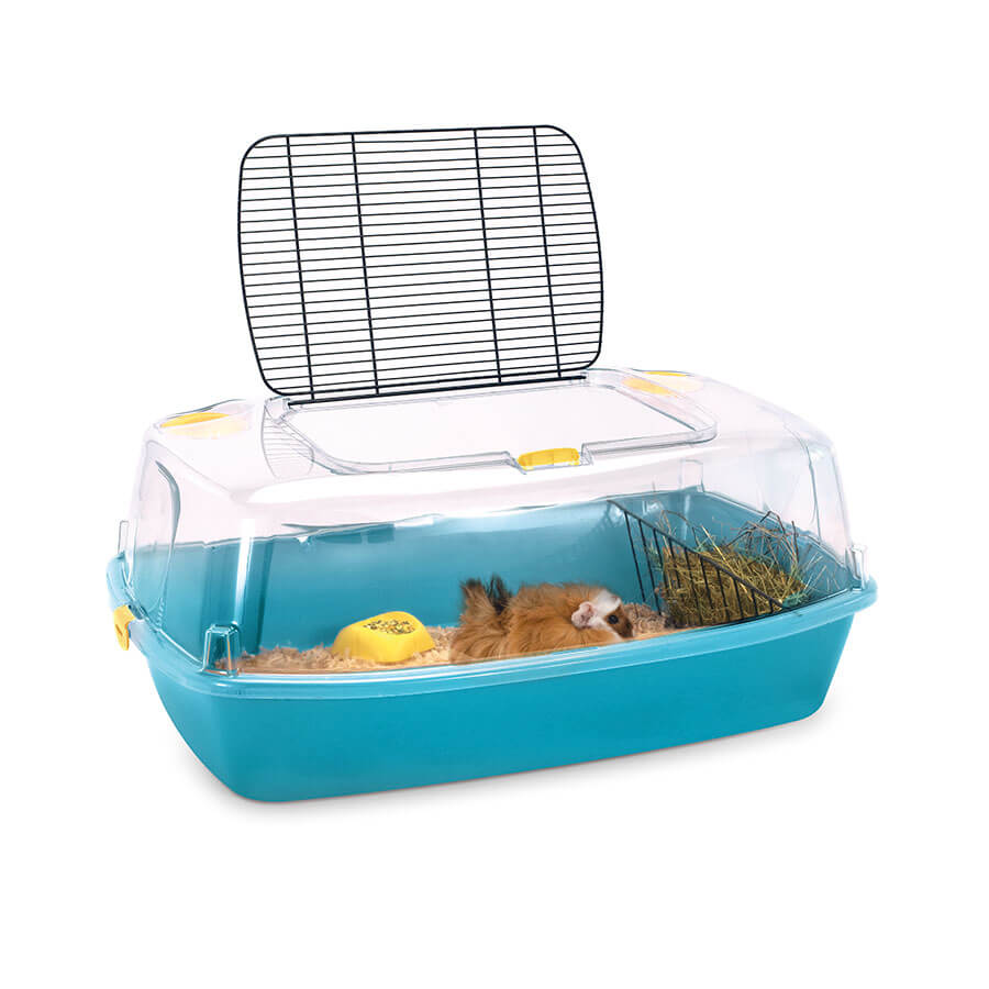 Comoda e funzionale gabbia per conigli e cavie, grazie ad un fondo in plastica e una struttura superiore in plastica trasparente, per avere sempre ben visibile il vostro piccolo amico. Un’ampia apertura in rete metallica verniciata posta sulla parte superiore, consente di effettuare tutte le operazioni di manutenzione e inserimento del cibo nella ciotola in plastica Fun Bowl e allo stesso tempo garantisce un perfetto ricircolo dell’aria. Completa la tua gabbia Bingo con l’optional Bibber 210 da fissare all’interno grazie a due ventose.